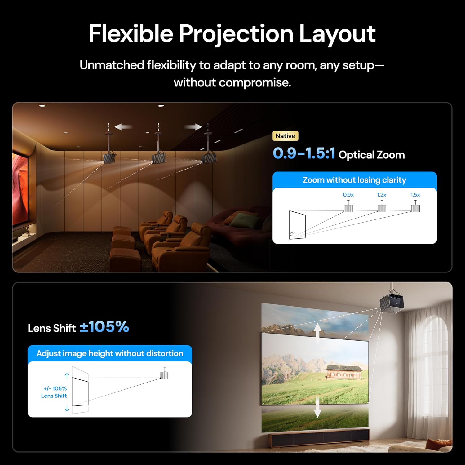 The Valerion VisionMaster MAX redefines the lifestyle projector. Featuring Dynamic Iris technology, motorized vertical lens shift (+/-100%), and 0.9–1.5x optical zoom, it’s the first consumer-grade projector to deliver professional lens control in a compact form factor.