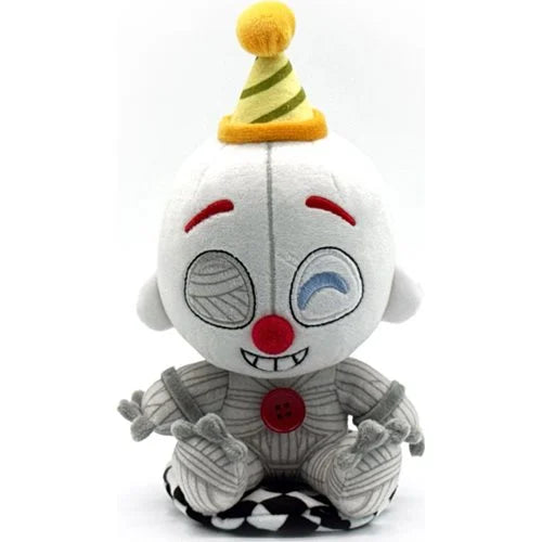 Intricate Design: Sitting at 6 inches tall, Ennard's grey-wired body features feet kicked forward and arms hanging by his side. A small smile graces his bright white face beneath a vibrant red nose, while his one working eye shines with a blue pupil. His missing eye reveals bunched wires that run through his head.