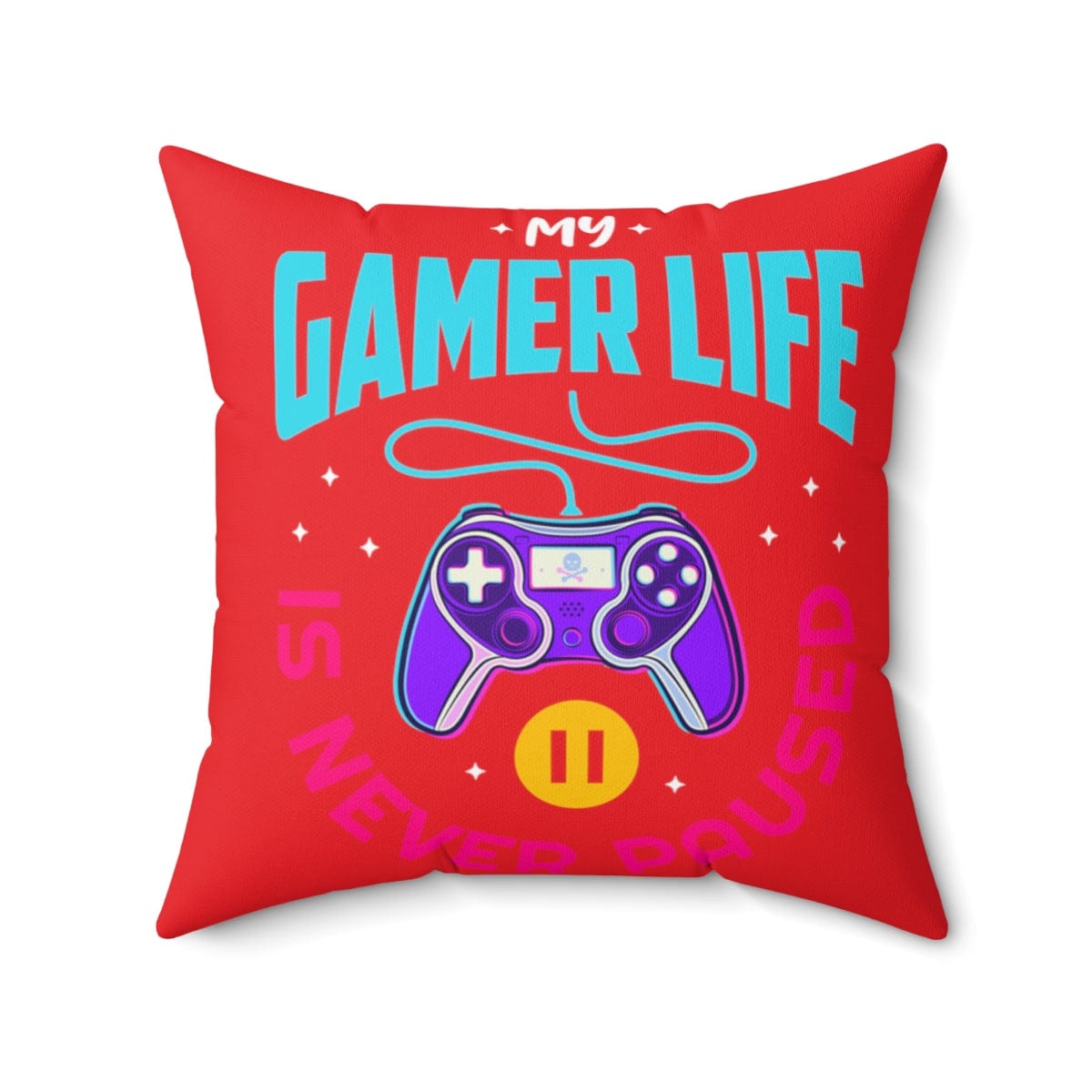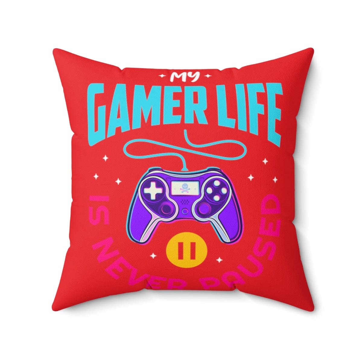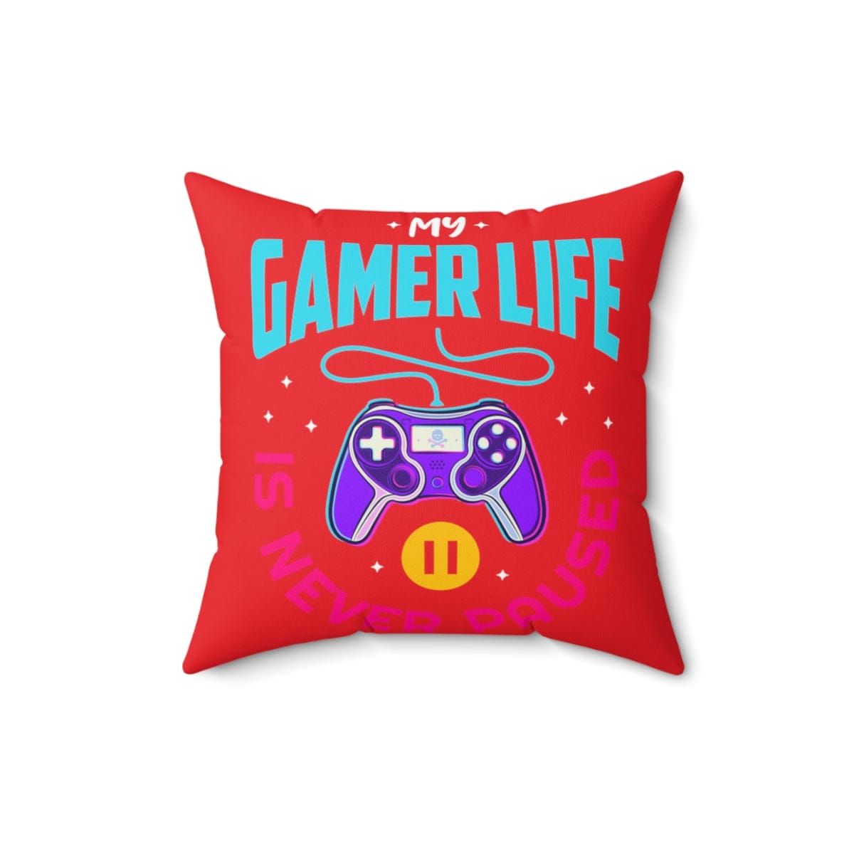 Room accents shouldn't be underrated. This beautiful indoor pillow comes in various sizes. This gamer pillow is meant to serve as a statement piece, creating a personalized environment for your gaming room, man cave, streaming room, or bedroom. Fun, campy, and cool. Let the world know about your gaming life...Is never paused. .: 100% Polyester cover .: 100% Polyester pillow included .: Double-sided print .: Concealed zipper .: Note: Pre-constructed item. Size variance +/- 0.5"