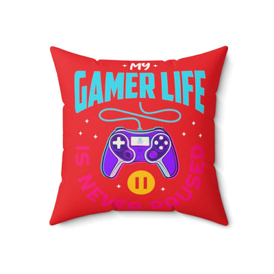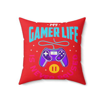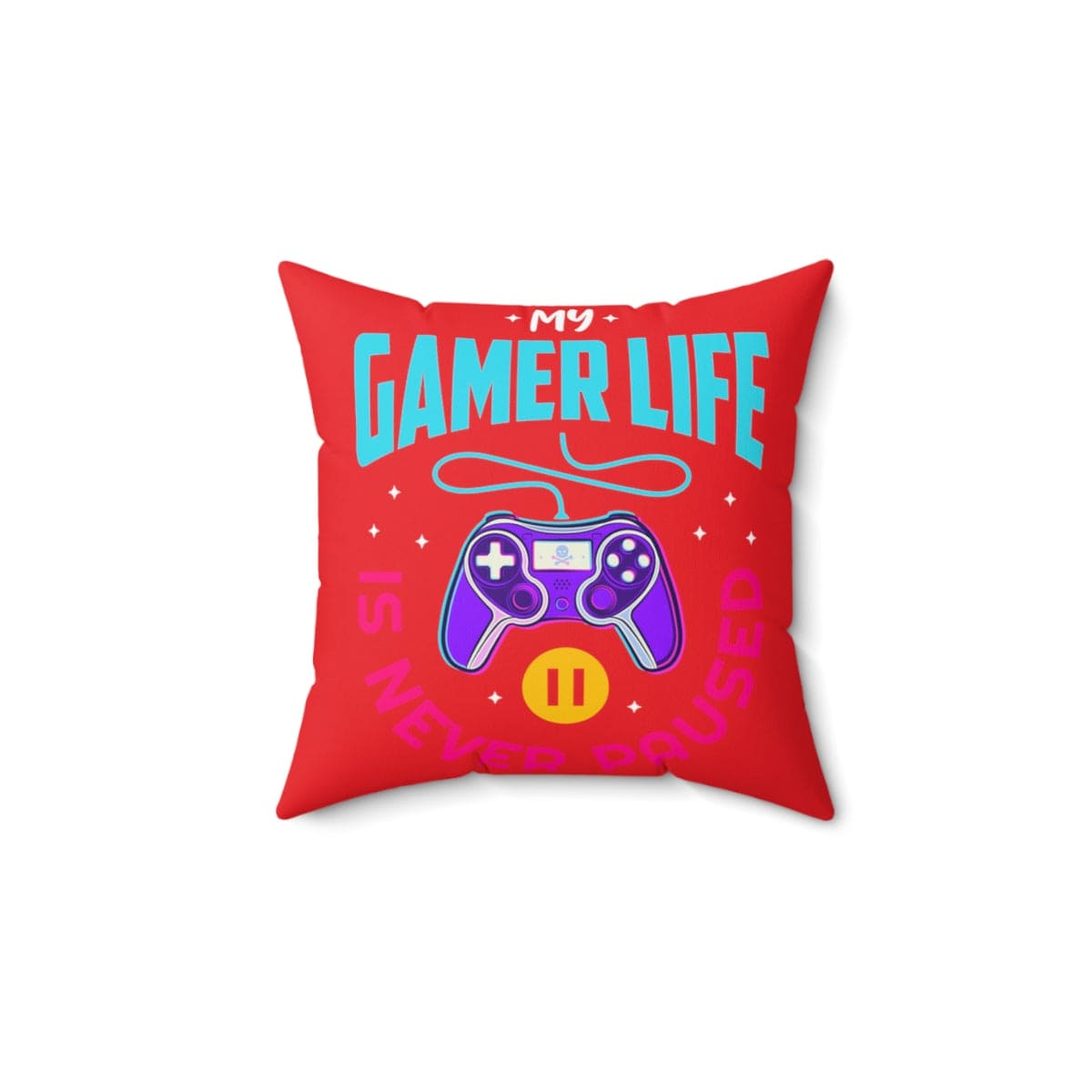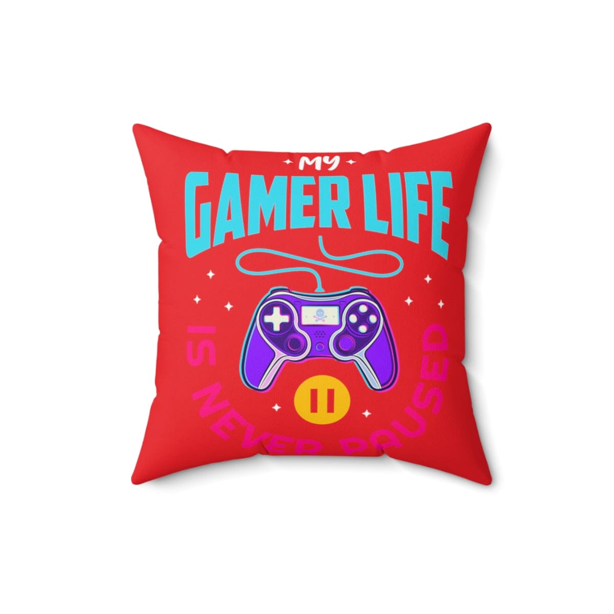 Room accents shouldn't be underrated. This beautiful indoor pillow comes in various sizes. This gamer pillow is meant to serve as a statement piece, creating a personalized environment for your gaming room, man cave, streaming room, or bedroom. Fun, campy, and cool. Let the world know about your gaming life...Is never paused. .: 100% Polyester cover .: 100% Polyester pillow included .: Double-sided print .: Concealed zipper .: Note: Pre-constructed item. Size variance +/- 0.5"